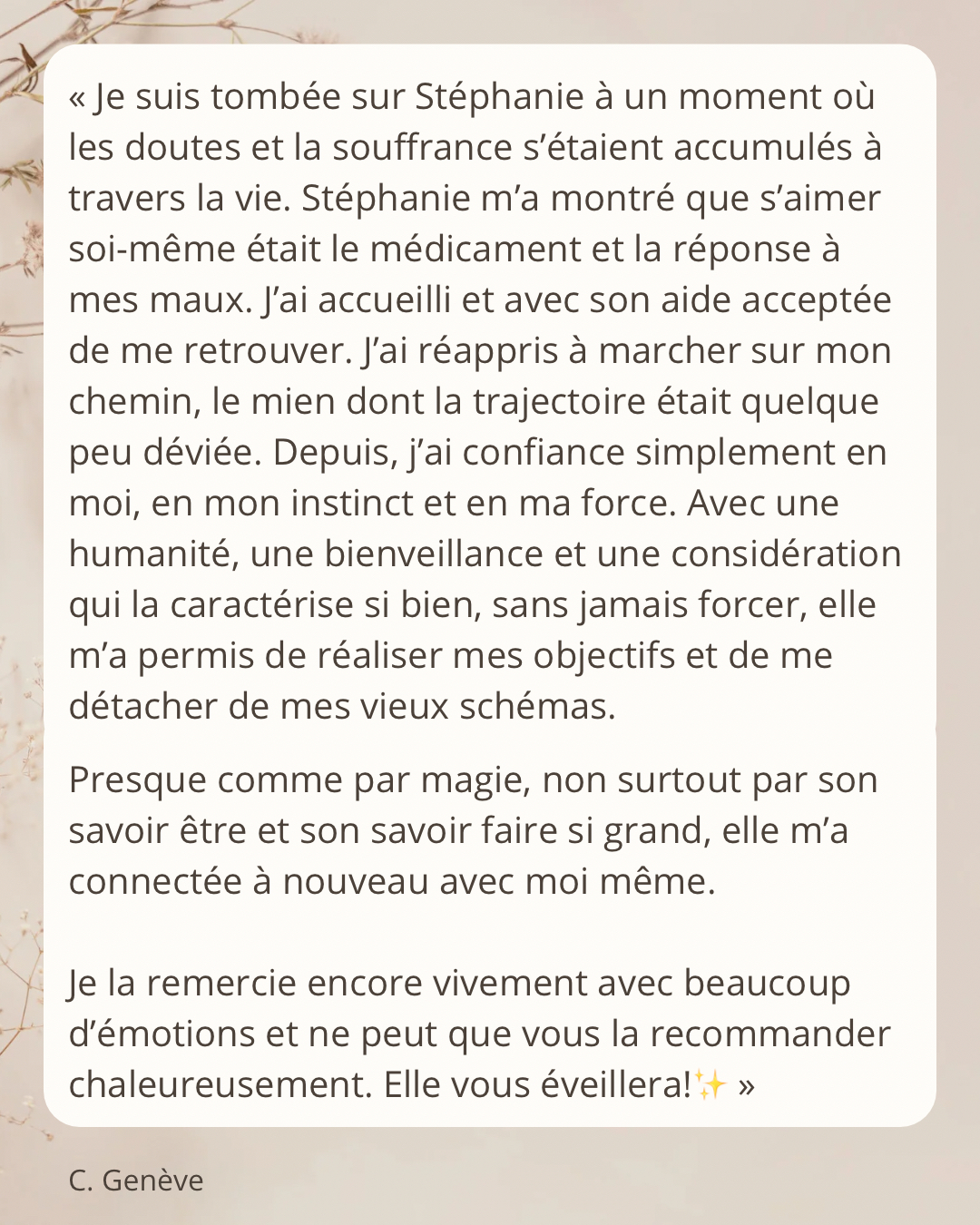 Un accompagnement d’exception, pensé dans la profondeur, la justesse et la présence. Un espace rare, confidentiel, pour celles qui sentent l’appel d’un véritable changement intérieur, et qui sont prêtes à s’y engager pleinement.