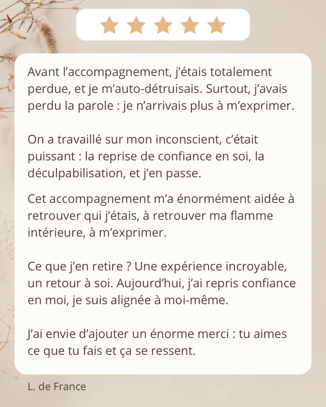 Un accompagnement d’exception, pensé dans la profondeur, la justesse et la présence. Un espace rare, confidentiel, pour celles qui sentent l’appel d’un véritable changement intérieur, et qui sont prêtes à s’y engager pleinement.